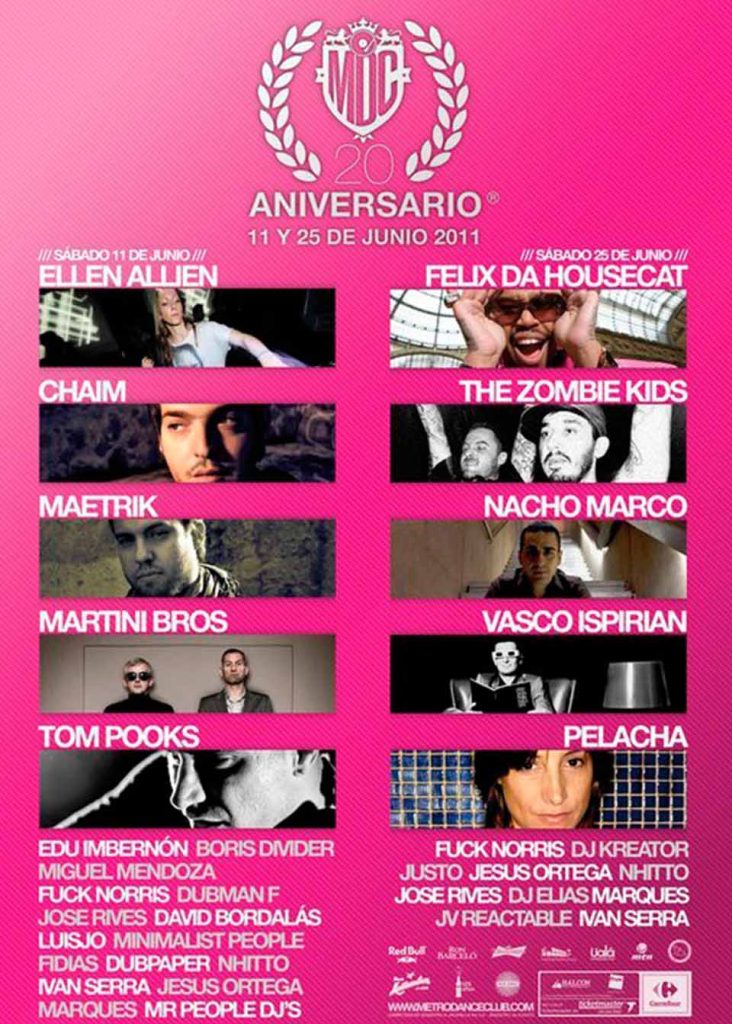 Dos décadas en pie y a la cabeza de la escena como uno de los centros neurálgicos del clubbing nacional. MetroDanceClub celebra su 20 Aniversario como sala de referencia para la electrónica patria. El 20 Aniversario tendrá lugar durante las noches del 11 y 25 de Junio y contará con un cartel espectacular lleno de grandes nombres tanto nacionales como internacionales. Artistas que han sido importantes dentro de la história de este gran club y que han congeniado de forma muy especial con la filosofía musical de Metro y con su público. El 11 de Junio tendremos a gente como Ellen Allien y Chaim de Bpitch Control, Tom Pooks de Kompakt, Maetrik de Cocoon y Martini Bros de Pokerflat como invitados internacionales, acompañados por grandes nombres nacionales como Edu Imbernón, Miguel Mendoza o Boris Divider, además de una larga lista de dj’s locales de gran talento y el equipo completo de residentes. El 25 de Junio el cartel estará encabezado por el mayúsculo Felix Da Housecat y los cada vez más populares The Zombie Kids. Pelacha, Vasco Ispirian, Elias, DJ Kreator y el valenciano Nacho Marco completar la plantilla de figuras nacionales que junto al show de JV Reactable y los dj’s residentes harán de esta segunda noche una velada muy especial.