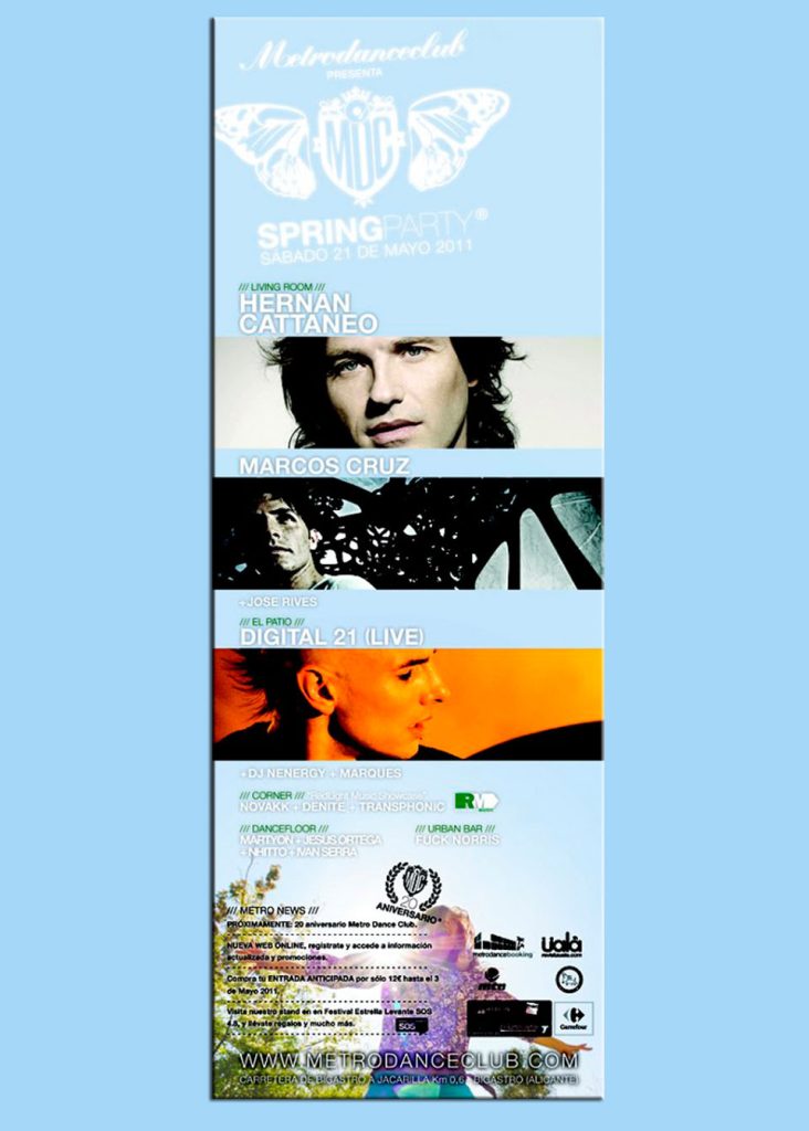 Damos la bienvenida a la primavera con un evento muy especial, una noche cálida, rítmica y sensacional encabezada por uno de los grandes, Hernan Cattaneo, todo un genio como productor y dj cuyo inmenso talento le ha llevado a recorrerse las mejores salas de todo el mundo. Junto a él una figura ya imprescindible en la nueva forma de entender el House en la península, Marcos Cruz, nos deleitará de nuevo con sus devaneos deep y percusivos. Y desde la capital llegan Digital 21, el nuevo fichaje de Anthony Rother para su sello y DJ Nenergy, que nos ofreceran una sesión Live/DJ de Electro-Tech de alto octanaje. Todos ellos estarán acompañados por el equipo de DJ Residentes habitual y una figura local, Martyon. En el Urban Bar volveremos a contar con la presencia de Fuck Norris y en el Corner tendrá lugar el “Showcase” de uno de los sellos discográficos más destacables de todo levante RedLight Music con la presencia de Novakk, Transphonic & Denite. Redlight Music presenta su primer showcase en Metrodanceclub. Una muestra sonora del sonido del sello en uno de los clubs más prestigiosos y con más trayectoria de nuestro país. Una auténtica celebración teniendo en cuenta que, para muchos de los artistas del sello, el club alicantino siempre ha sido un punto de referencia musical y un lugar en el que han disfrutado de muchas sesiones de grandes iconos de la música electrónica durante sus más de 10 años de vida como club de referencia a nivel nacional. Encabezando el cartel estará DENITE (Resopal Red / Trapez / MBF / Redlight Music). Responsable de temas como «Black Hat» o «Belong» en Resopal Red o del remix de «Sliding Away» para 2020 Vision. Y que actualmente ha pasado a formar parte de la familia Traum-Trapez-MBF. La importancia del público, del baile y de la música son sus tres grandes bazas. Contaremos también con Novakk (Redlight Music, Animale), que nos deleitará con otro dj-set al estilo de su set de nochevieja en Metrodanceclub. Presentando su directo al más puro estilo analógico estará Transphonic (Redlight Music). Un directo repleto de sintetizadores que invita al movimiento. Un techno de alto standing de corte elegante y trabajado. Y cerrado el cartel estará el fundador del sello: Gari Marcos. Una invitación a bailar, al disfrute y a pasarlo bien con la familia Redlight Music en uno de los clubs más especiales del panorama nacional ¿se puede pedir más?