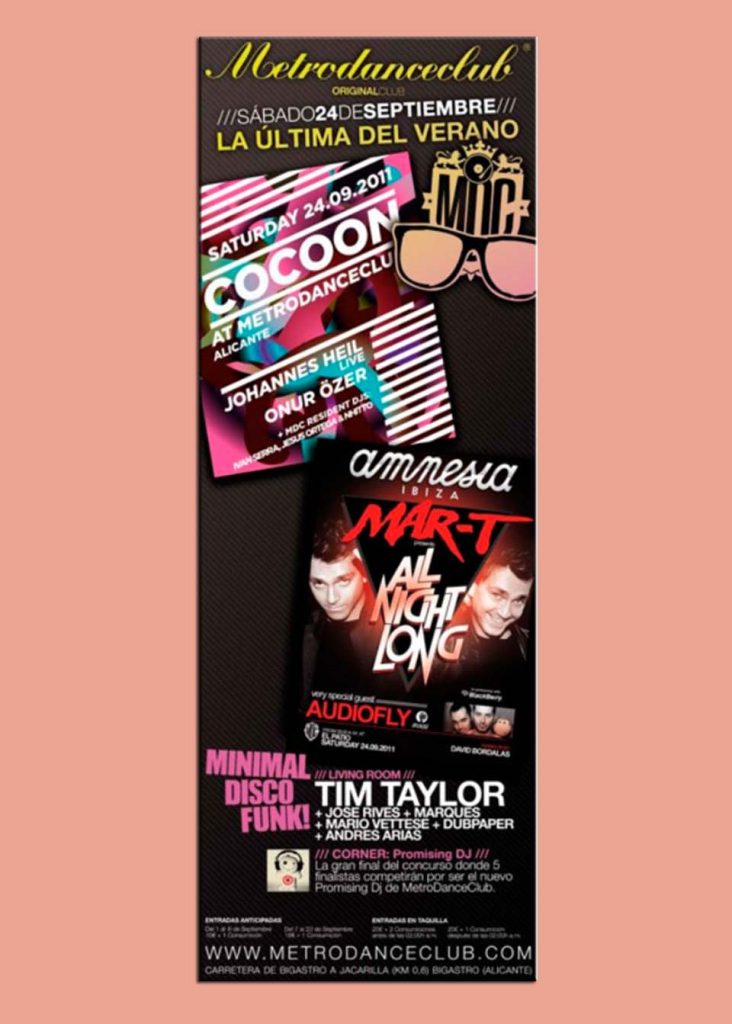 Llega el final del que ha sido un verano muy especial para MetroDanceClub, y el colofón lo pone esta nueva entrega de “La Última del Verano” que se ha hecho coincidir en el tiempo con los días previos a los cierres de las discotecas más famosas de Ibiza. Y esa va a ser la temática de nuestro último evento veraniego: El trasladar a la mítica sala levantina el espíritu, la música y las sensaciones que se viven cada verano en la Isla Blanca cuando acaba la temporada estival. Amnesia, el considerado mejor club del mundo (Miami IDMA) por tercer año consecutivo, y también coronado por las 5 estrellas doradas de “Club Judge” (el equivalente a la guía Michelin del clubbing internacional), aterriza en Metro tomando dos de las salas principales para recrear dos de las fiestas más famosas que han tenido lugar en Ibiza. “Cocoon” con Johannes Heil (Live) y Onur Özer como cabezas de cartel. Techno al más puro estilo germano pero de matices minimalistas, tribales y con mucha alma. El Tech-Soul procedente del sello del Kaiser Sven Väth tomará el “Dance Floor” de Metro durante toda la noche del sábado y se dejará acompañar de los ritmos endiablados de los residentes Nhitto, Jesús Ortega e Ivan Serra. “All Night Long” una de las nuevas fiestas más sensacionales en esta temporada, que ha compartido cartel cada viernes en Amnesia junto a los conciertos de “I Want My MTV Ibiza” y que viene presentada de la mano del omnipresente y experimentado DJ residente de Amnesia, Mar-Tque junto a unos invitados de lujo como son Audiofly (Get Physical Music) van a presentar el lado más deep y underground de las noches ibicencas. David Bordalás será el dj residente perfecto para calentarles la pista a las 5 de la mañana en “El Patio”.