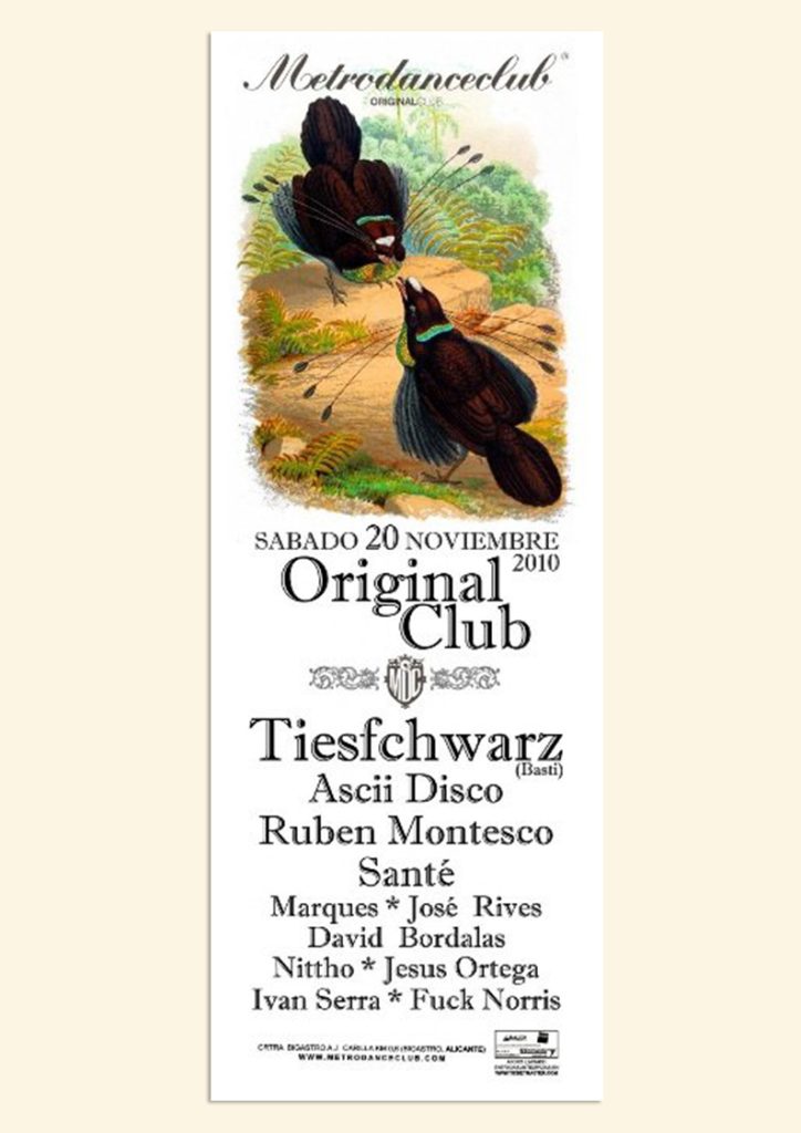 Original Club ha sido el slogan de Metro durante muchos años, también se ha convertido en su ?modus vivendi? particular y ahora pasa a dar nombre a una serie de noches muy especiales que se irán desarrollando en la Sala durante la nueva temporada. Las noches Original Club se verán colmadas de una propuesta musical muy exquisita y con un concepto estilístico visualmente muy innovador. Y no hay mejor forma de empezar la primera edición que contando con el dúo alemán Tiefschwarz, que acaban de volver a ser noticia de actualidad gracias al estreno de su nuevo álbum ?Chocolate? en el sello Souvenir Music. La popular pareja de hermanos no ha dejado de dar que hablar durante todos estos años en que se han consolidado como los embajadores del nuevo house germano y se han convertido en una de las parejas de remezcladores más demandadas; Masters at Work, The Rapture, Cassius, DJ Hell, Missy Elliot o Kelis han contado con sus servicios. Basti, el 50% de Tieschwarz será el encargado de demostrar que al contar con una sola de las partes de la ecuación también se consigue el mismo resultado; House vanguardista, cargado de Funk y tramas Deep-Tech muy energéticas para el Living Room. Santé ha sido el gran descubrimiento que han hecho los Schwarz, se ha incorporado a trabajar con ellos en la producción del álbum y después de varios maxis propios para el sello y también para Radio Slave en Rekids, este productor originario de la provincia de Swabia está considerado ya como uno de los talentos emergentes dentro de la escena house del centro y norte de Europa. Con un sonido moderno y a la vez clásico su dominio de las texturas del House lo convierten en un auténtico cazador del ?groove?. David Bordalás, Jose Rives y Marques volverán a redondear la noche y nos llevarán hasta el amanecer con su sonido Tech-House festivo y embriagador. En el Dance Floor tendremos unos invitados excepcionales, procedentes de la capa más underground de la capital llegan Ruben Montesco y Ascii Disko, dos de los exponentes más reconocibles de la escena Electro-Tech y EBM, residentes en el infame Club Stardust de Madrid. Confiando en que serán capaces de recrear el ambiente bizarro y festivo que se vive cada fin de semana en su club, Ruben Montesco viene apadrinado por una dilatada trayectoria como DJ y productor de música Industrial y techno, dónde también han tenido cabida el Minimal y el Acid-House, así mismo Ascii Disko es conocido por sus devaneos electrónicos con el Indie-Rock, y es capaz de fusionar en sus sesiones y producciones todas sus influencias heredadas del sonido Italo con la EBM y el Acid-Disco. Ivan Serra y Nhitto acompañaran a los dos invitados y empaparán el resto de la noche con su estilo cortante y afilado, dejando que Jesús Ortega haga los honores y les encarrile la noche con sus sonidos hipnóticos y minimalistas. Fuck Norris será la pareja invitada en el Corner, también conocidos por Borch y Sanex respectivamente, son especialistas en desarrollar sesiones a cuatro manos con altas dosis de Post-Punk, Electro-Disco y breaks Indies. Clásicos alternativos y bombazos Dance de ultratumba se funden apasionadamente en sus sesiones.